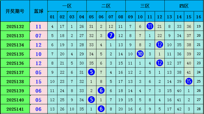 蓝球:前10期蓝球分手为:11 07 12 10 12 05 15 06 05 06,其中奇偶蓝球奇偶数球均等,本期看好偶数蓝球,参考蓝球12.